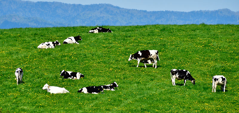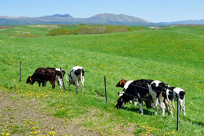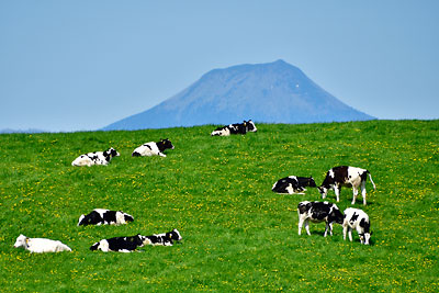 放牧された牛たちと、西別岳(左)と斜里岳(中央)