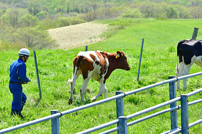 人工授精や健康確認を終えたあと放牧、広い牧場へ…