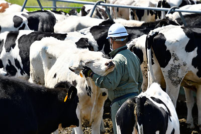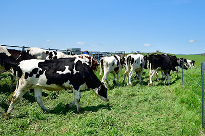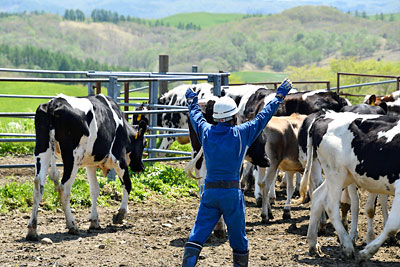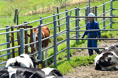 牛舎で健康状態をみていた牛を放牧地へ移動