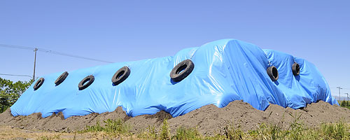 土の上に積み上げ、まとめてシートに包むことにより余分な水分が地中に吸収され、牧草は最適な状況に発酵されます。