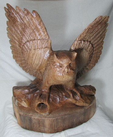 ふくろう 羽ばたき 槐 台付き 台から 高さ約44p 横幅約40 \ 54,000円 エンジュ材 使用 羽を広げ、羽ばたき、悪を威嚇し 幸せを招き入れるような彫刻のふくろうです