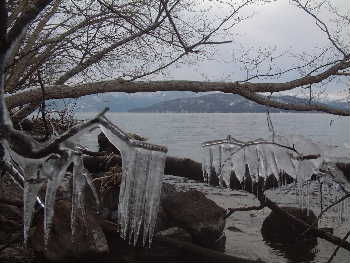 撮影したのは午後でしたが、屈斜路湖岸の木には波や水蒸気でできたツララがついていました。
