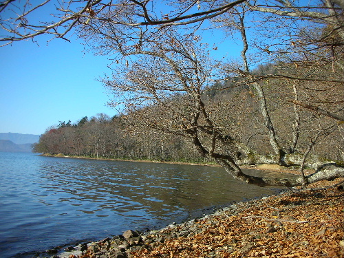 湖の氷は落ちましたが、まわりの山には、まだ雪が残っていまする