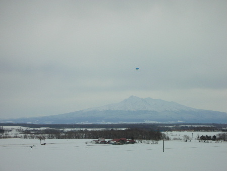 斜里岳をバックに熱気球を撮影。豆粒のようにしか見えませんね・・