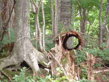 ミズバショウの群生。枯れ木の穴、コロポックルの家?