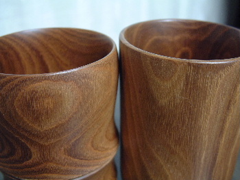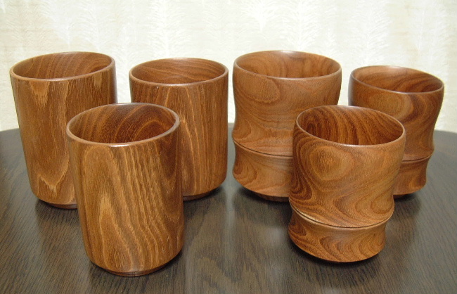 エンジュ材 左3個はエンジュ湯呑 大・中・小 右3個はエンジュ湯呑竹型 大・中・小