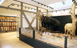 館内は、標茶町博物館の前身である「標茶町郷土館」にて展示していた資料を中心に配置していますが、展示スペースが広くなったため、これまで展示していなかった資料を多く追加しています。また「標茶のアイヌ文化」「標茶の近代」展示室は、天井が高く開放的な展示空間で、高さを生かした資料配置を行ったほか、障がいのある方などのためにエレベーターを設置、ゆっくりと時間をかけて鑑賞できるよう、展示途中で休憩できる椅子をいくつかの展示室内に配置しています。