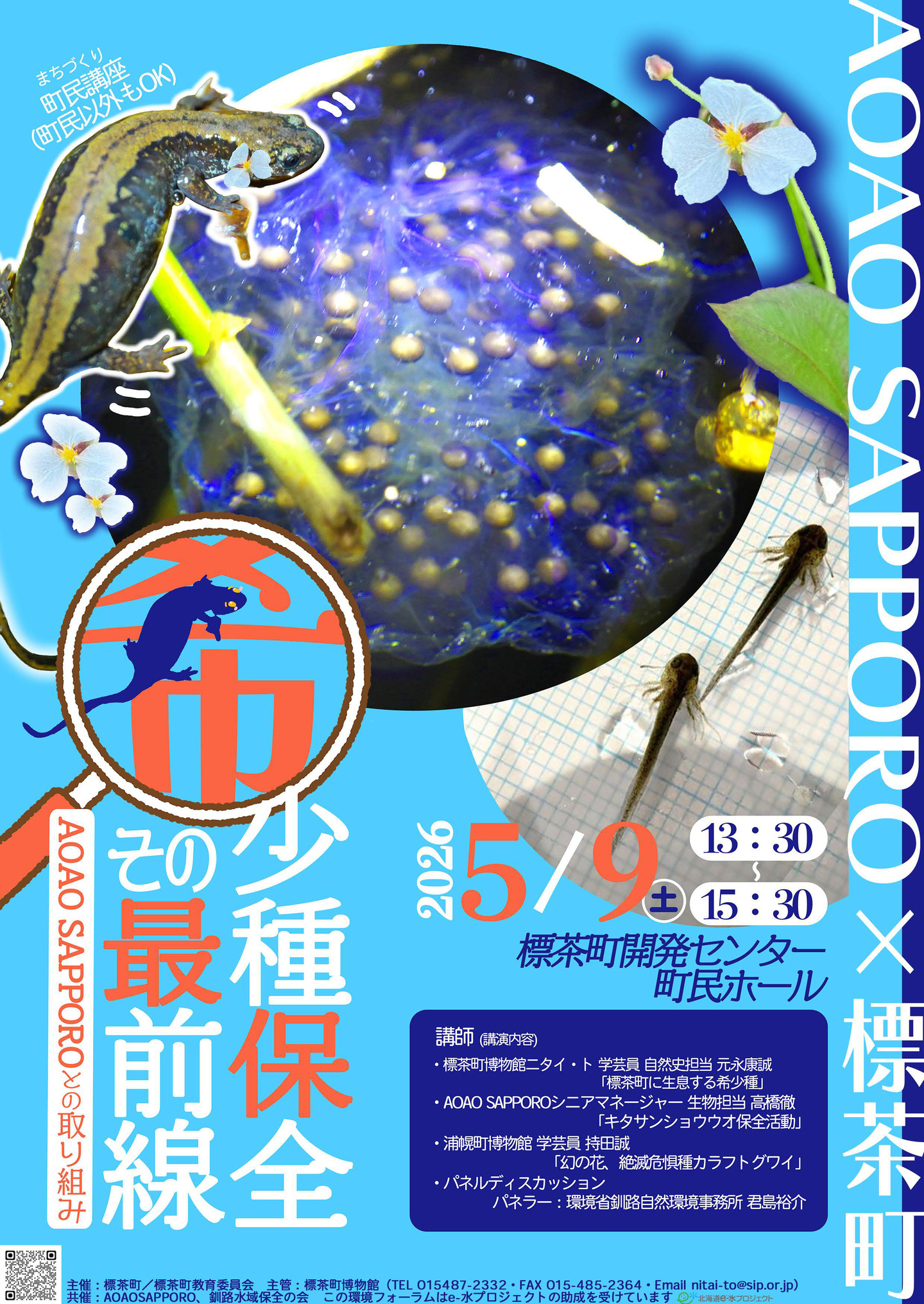 本フォーラムでは、町内で進めているキタサンショウウオの保全活動を中心に、標茶町に生息する希少動物の現状と課題について紹介します。あわせて、AOAO SAPPOROとの連携による飼育・保全の取り組みについても報告し、野生生物と人との関わり方について考えます。