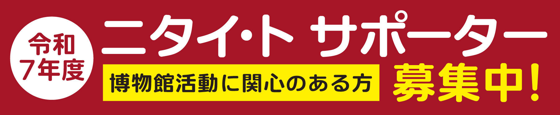 | 2025/3/28 | 【お知らせ】令和7年度「ニタイ・トサポーター」を募集いたします。博物館活動に関心がある方、ぜひ私たちと活動しませんか? 詳しくはコチラから または右バナーよりご覧ください。 |