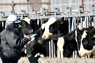 冬を迎えた標茶町育成牧場では、牛舎による冬期舎飼が行われています。 牛舎で暮らす牛たちは、朝の給餌で配合飼料、発酵させた牧草など次々と餌を与えられますが、餌を食べるためにゲージに並んでいる間に、発情のチェックや検査・人工授精・妊娠確認を行っています。 冬期の牛たちは日当たりの良いパドック付きの牛舎で暮らし、人工授精を終えて出産が近くなると生まれた牧場に帰ります。 この日は、標茶町内の牛をひとつの牛舎にまとめる作業が行われました。