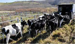 広くて起伏の大きな牧場ですごし、逞しくなった牛たちは牛たちは一ヶ所に集められ、牧場ごとにトラックに乗り、ふる里の牧場に帰って行きました。